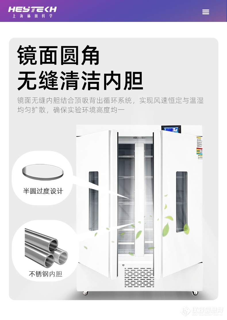 镜面不锈钢内胆:四角采用光滑半圆弧过渡设计,彻底消除清洁死角,便于消毒和清理,维持箱内洁净环境。