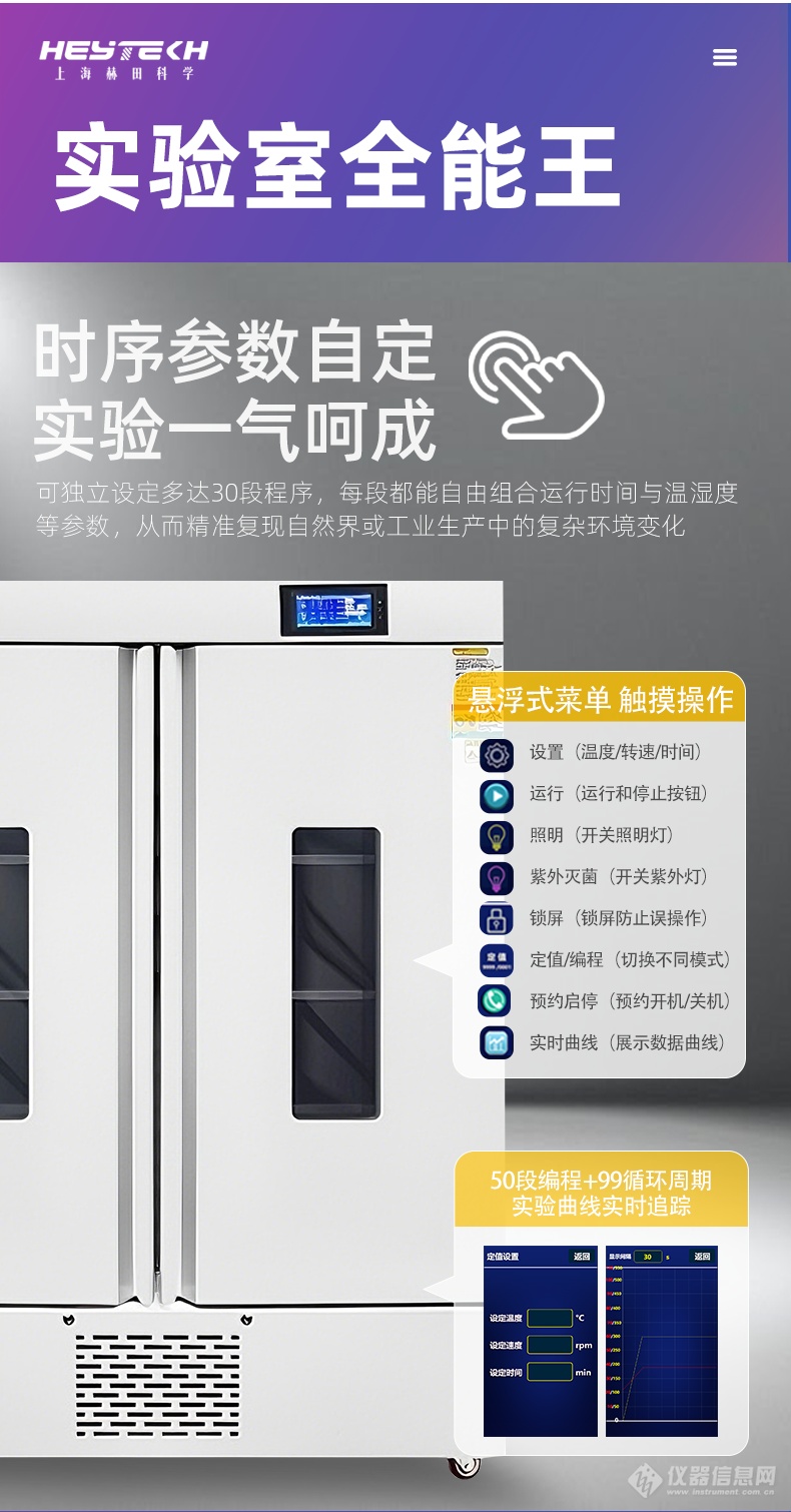 30段程序编程:每段程序可独立设定0~999小时运行时间及不同参数组合,灵活应对多阶段、变参数的复杂实验流程,极大提升实验自动化水平与效率。