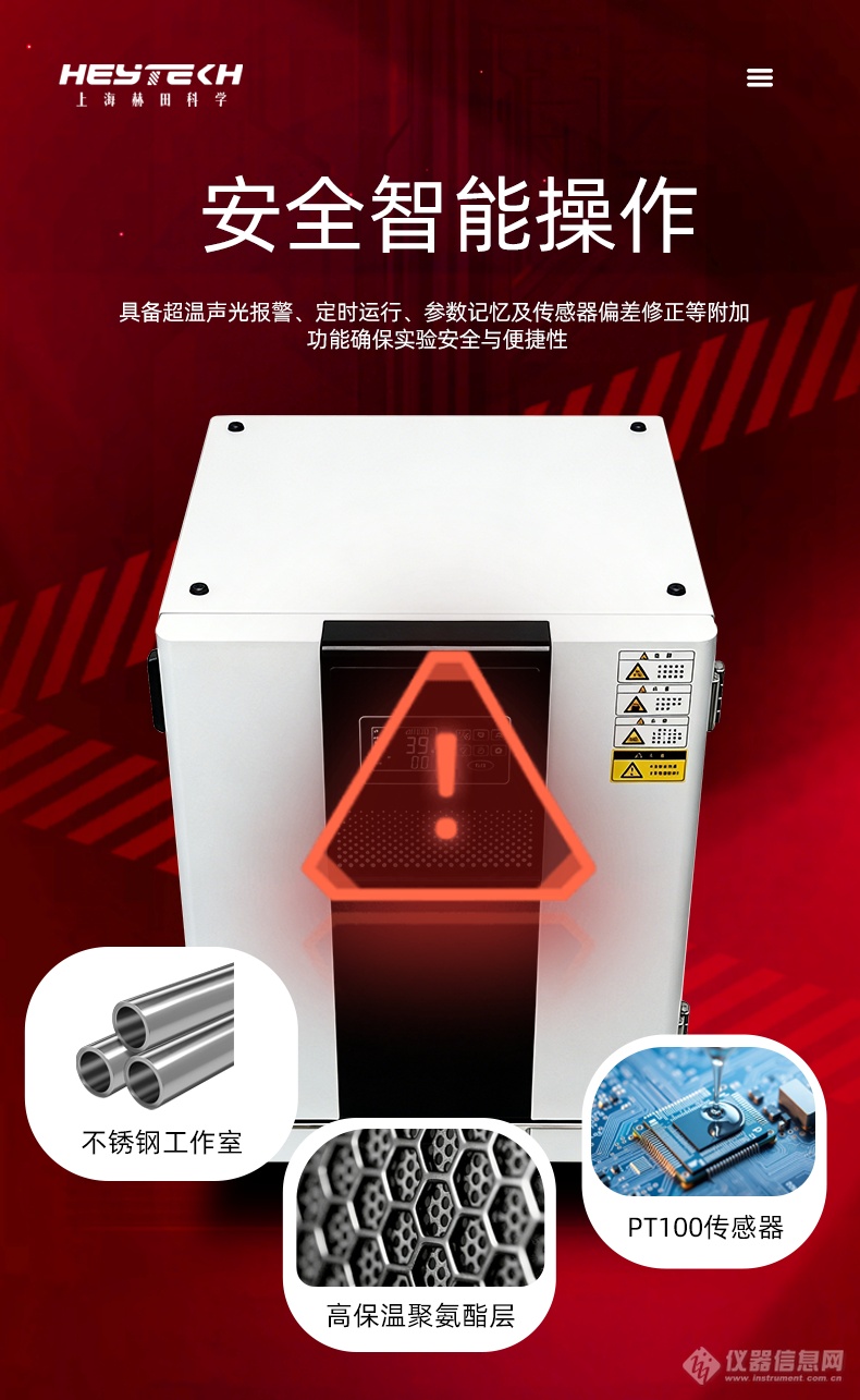 3、 安全防护:内置超温声光报警系统,实时监控箱内温度异常;外壳采用冷轧钢板静电喷涂,坚固耐用;工作室为镜面不锈钢板,易清洁、耐腐蚀。
