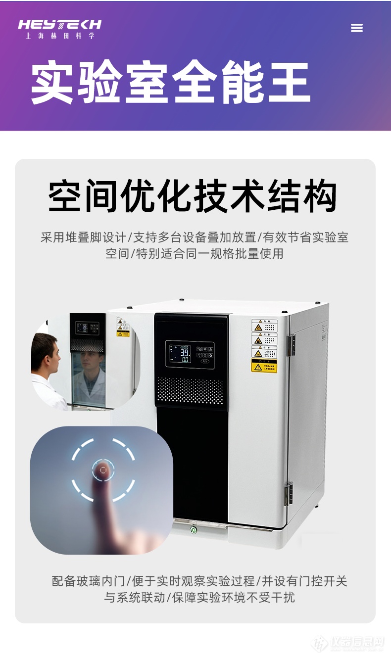 2、 空间优化:采用堆叠脚设计,支持多台设备垂直叠加,极大节省实验室台面空间,特别适合批量样品并行处理。