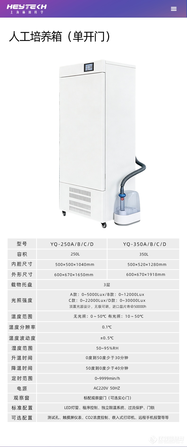 可选配置 | 实心门、测试孔、触摸屏仪表、CO2浓度控制、嵌入式打印机、远程手机报警、专业光谱(红蓝光等) |