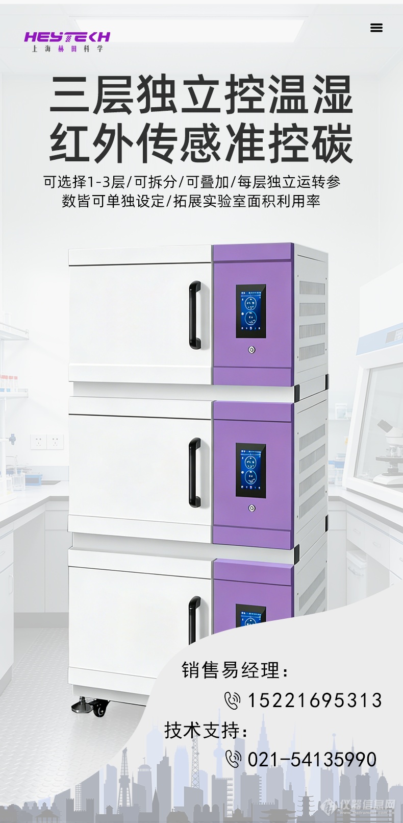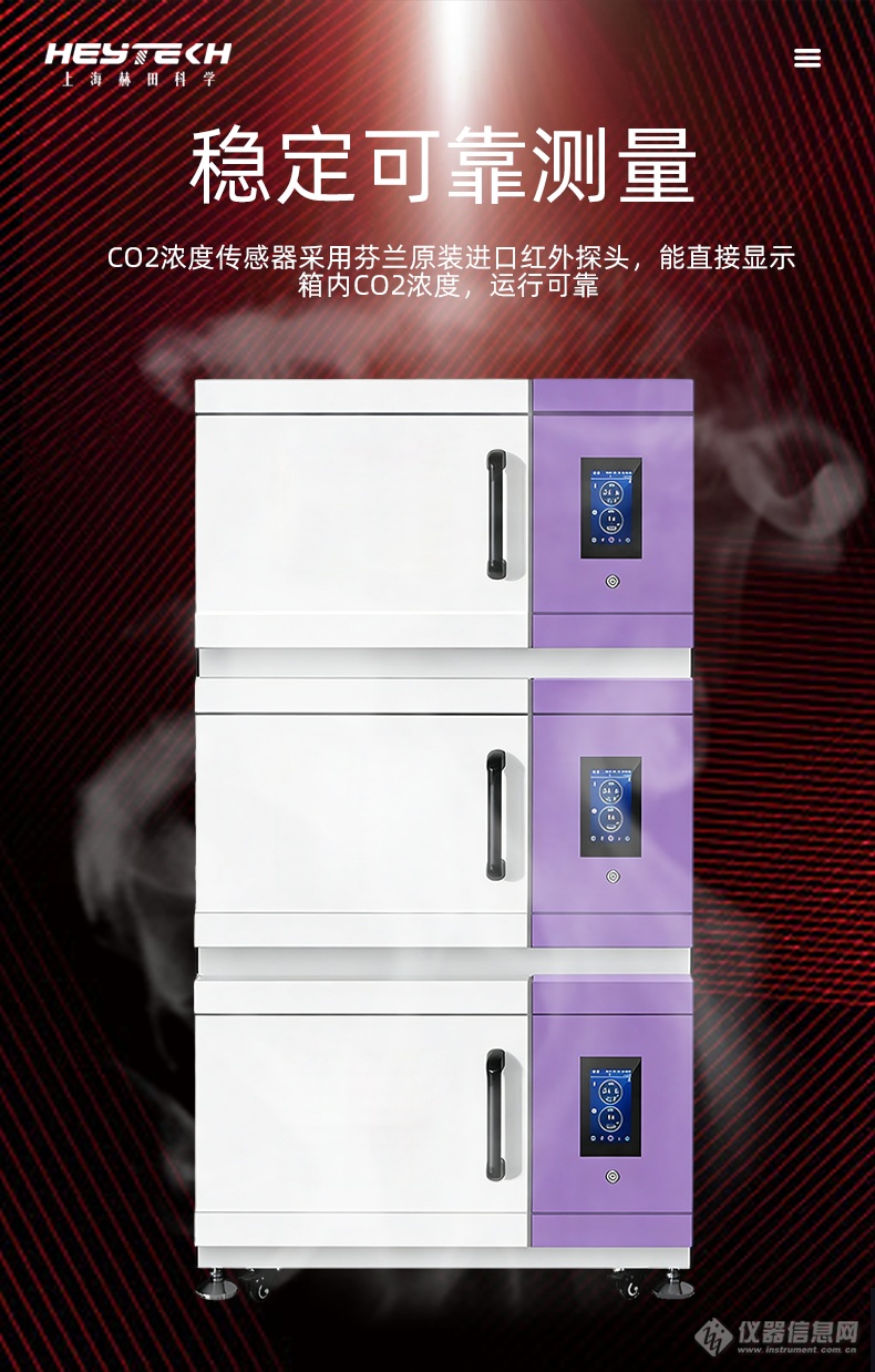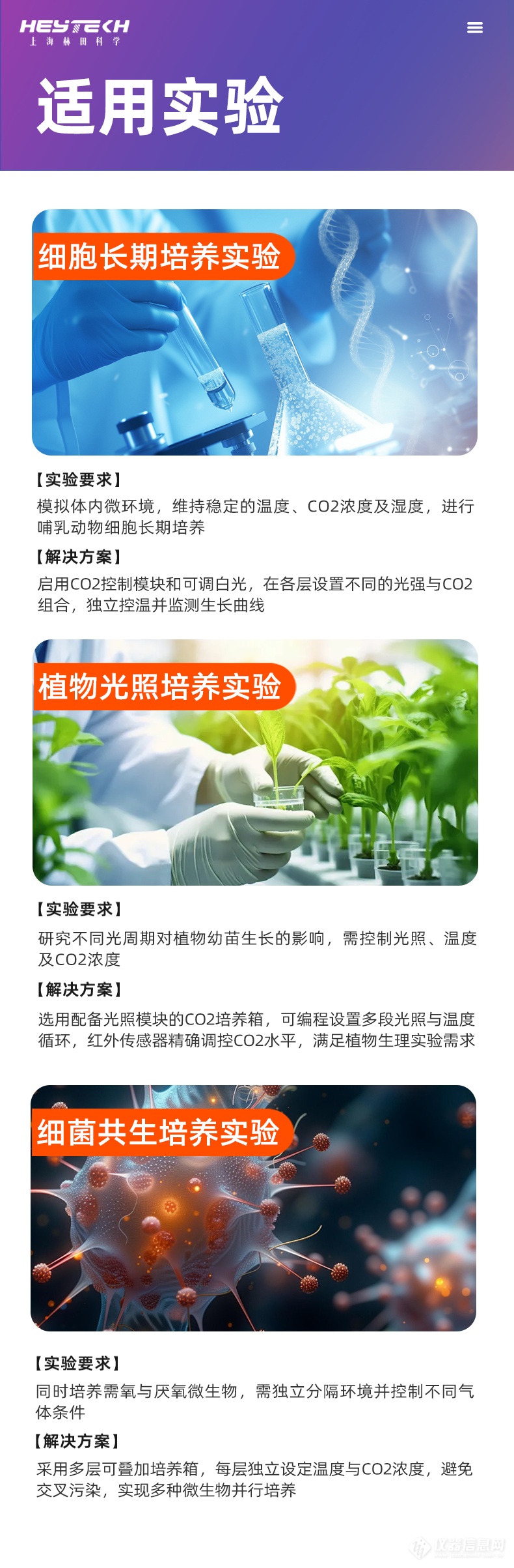 1) CO2浓度管理:采用红外传感器与电磁阀自动控制,精度达0.1%,范围0-20%,满足细胞培养等精细实验需求
