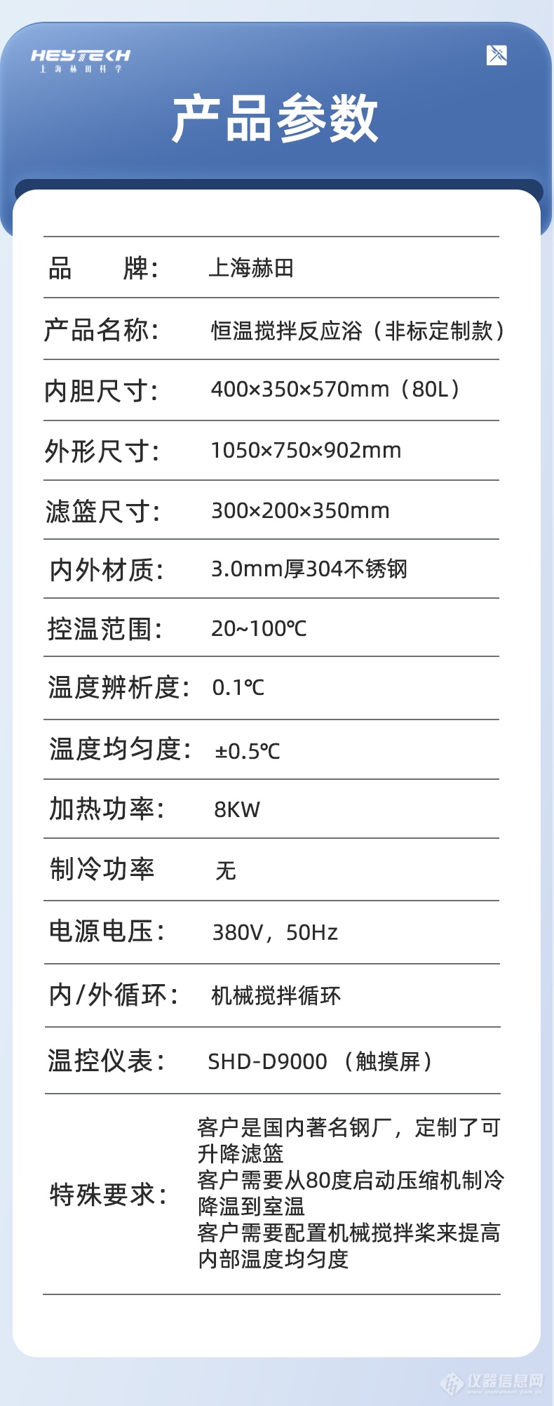 | 特殊说明 | 快速制冷、可升降滤篮、机械搅拌均为客户要求定制 |
